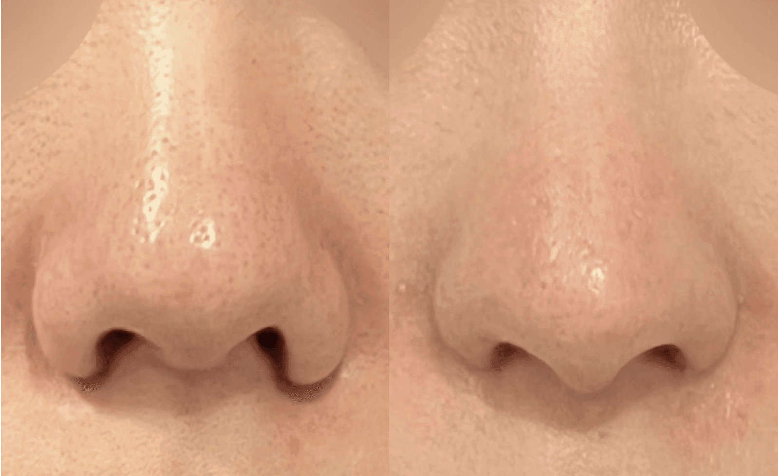 鼻翼の垂れ下がりが強く、小鼻の肉厚減幅感があるため存在感のあるお鼻となっていました。小鼻縮小や鼻孔縁挙上で鼻翼の形を整えると同時に鼻先の形も綺麗に形成して自然な忘れ鼻となっています。